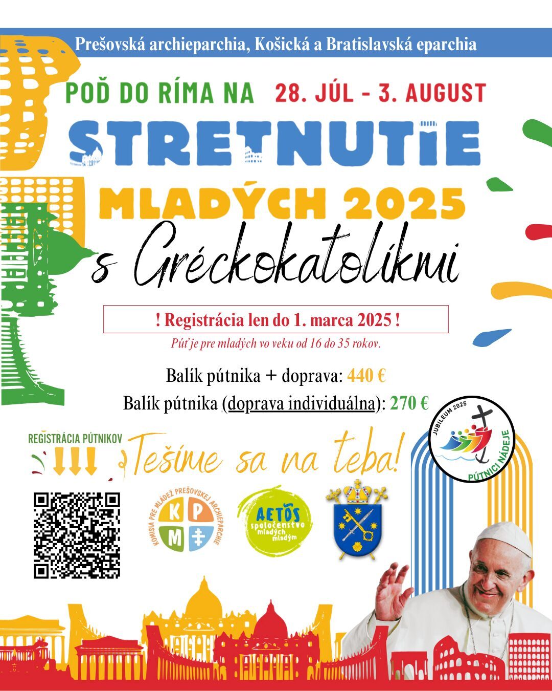 srdečne vás pozývame na Púť mladých Slovákov-gréckokatolíkov do Ríma v jubilejnom roku 2025 na jubileum mladých. Odchod zo Slovenska je naplánovaný na pondelok 28.07.2025 a príchod 05.08.2025. Ak máš 16 až 35 rokov, neváhaj a pridaj sa k nám. Cena za púť je 440 € s dopravou a 270 € bez dopravy (iba balík pútnika, s tým, že daný človek si zabezpečí dopravu do Ríma sám).